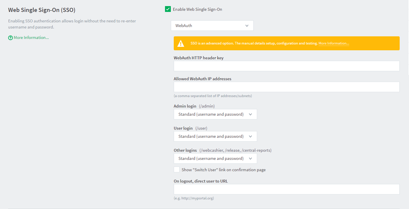 In the Web Single Sign-on (SSO) area, select the Enable Single sign-on check box to enable SSO. Additional configuration items are displayed.